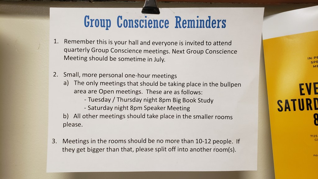 Thank you to those who were able to attend The Group Conscience. The discussed topic was about changing the 8pm and the 6pm meetings to an earlier time. It was determined that the majority of people were not interested in adjusting the times and therefore it will not be going to a vote. This idea was put forth in the hopes of getting people with at least a year’s sobriety to attend the later night meeting. The 8pm meetings have seen a downturn in attendance of those members who the promises have started to come true for. As multiple members pointed to the 12th step it would be a great service to the newcomer if we could bolster the experience, strength, and hope at the 8pm.